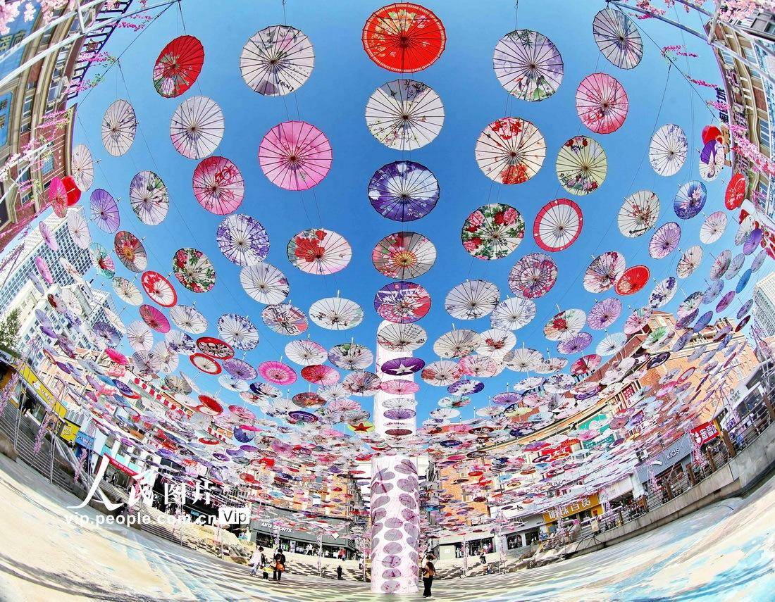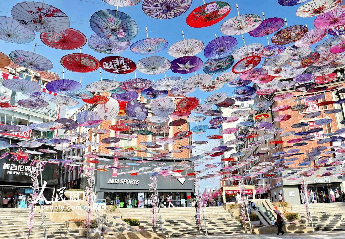 近日,河北省秦皇岛市太阳城商业区管委会依托地形,结合实际情况在中心广场安装由多种风格油纸伞拼成的“天空之伞”景观,吸引了众多市民和游客的目光,纷纷驻足拍照留影,感受“人在伞下走,如在画中游”的美好。曹建雄摄(人民图片网)