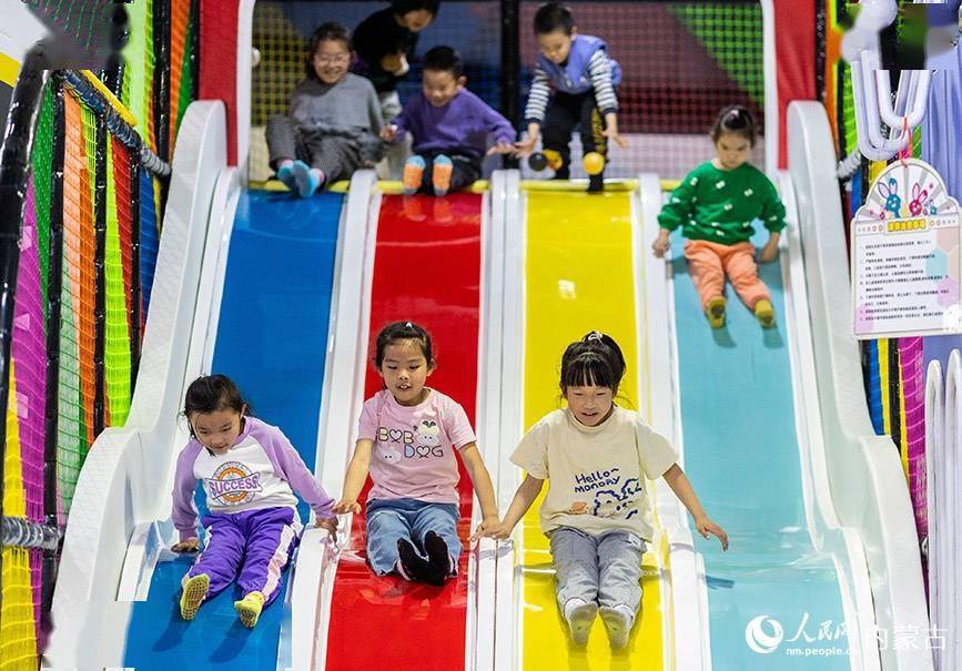 4月29日,小朋友在呼和浩特市玉泉区的七彩城购物中心游乐区内玩七彩滑梯。丁根厚摄