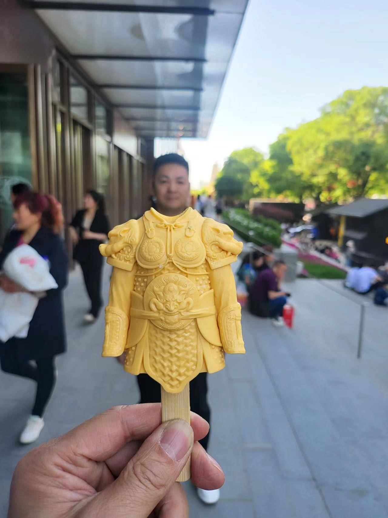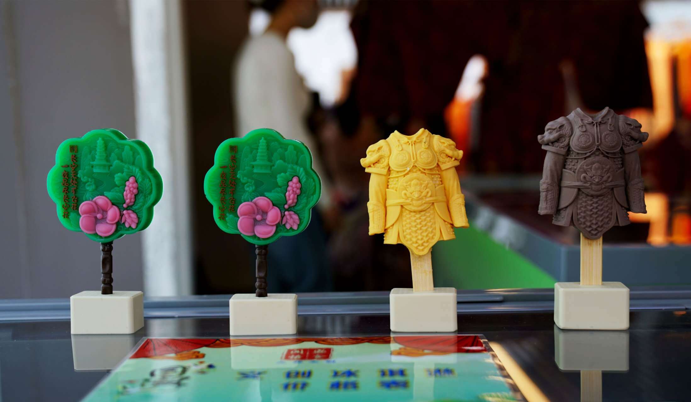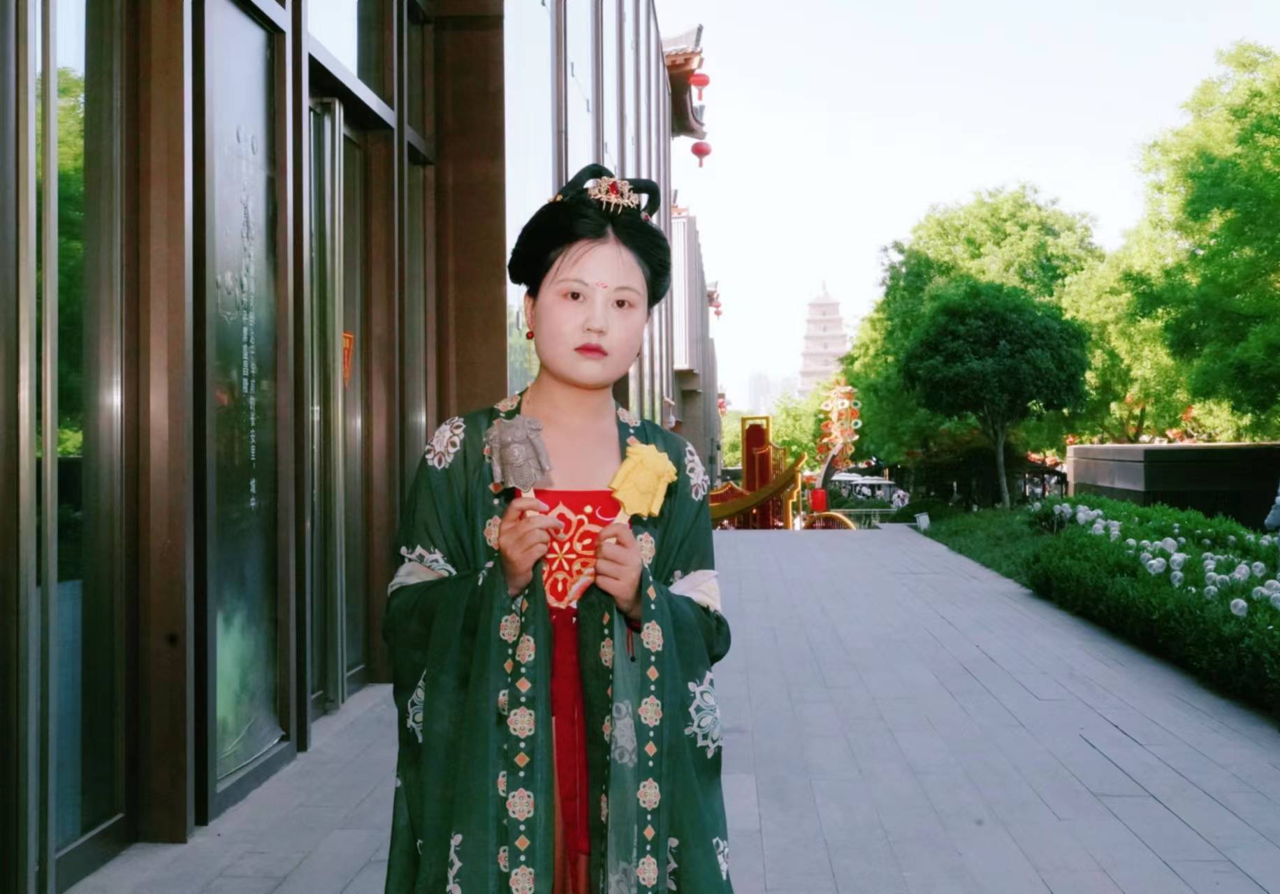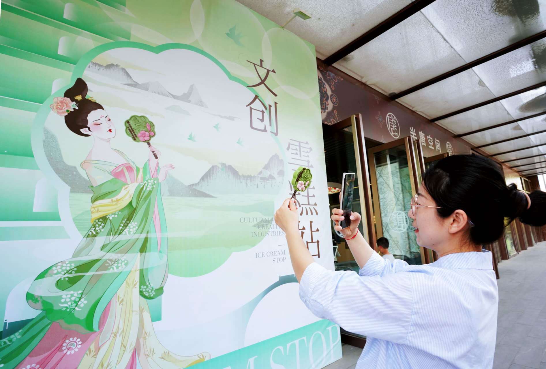 团扇多色冰淇淋,外形以唐代团扇为原型,上绘图案展现的远景是西安历史文化地标大雁塔,近景石榴花是出自西安大唐铜镜博物馆馆藏文物的背部纹饰,并配有两句诗文,尽显长安繁华。大唐明光铠冰淇淋,则是以唐代甲胄为原型,护腰和护肩都是虎头形状,每一片鳞甲都精细呈现,还推出巧克力、芒果两种口味供游客选择。雪糕互动解锁打卡新方式在任何一个城市,穿着唐装、汉服走在大街上都有些格格不入,除了西安。
