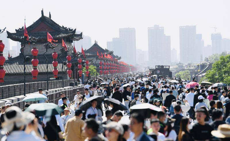 4月29日,市民和游客在城墙景区游玩。当日,“五一”小长假第一天,西安旅游开启火热模式。在城墙景区,“唐小妃”为游客画花钿,让游客沉浸式体验国风妆容;“金甲武士”巡游展演,“一秒穿越”感受大唐雄风;长袖飘飘、踏歌起舞的佳人表演秀等演艺节目让游客感受到古城西安独特的文化与魅力。