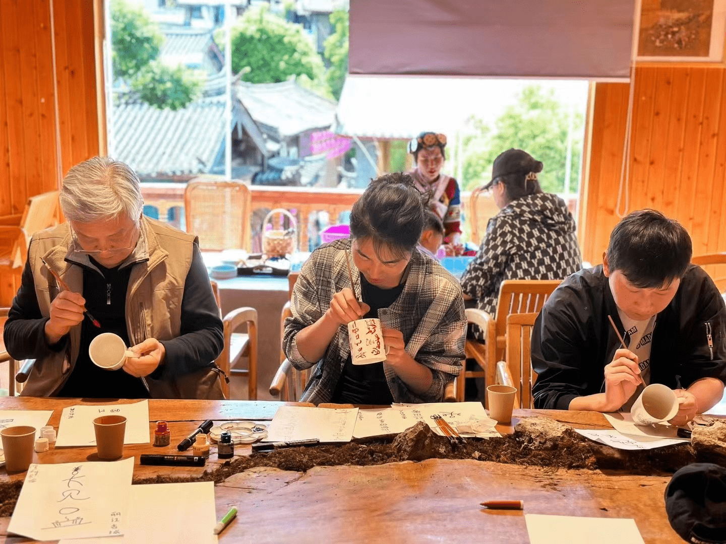 游客和民宿管家制作纳西族东巴文工艺品(受访者供图)