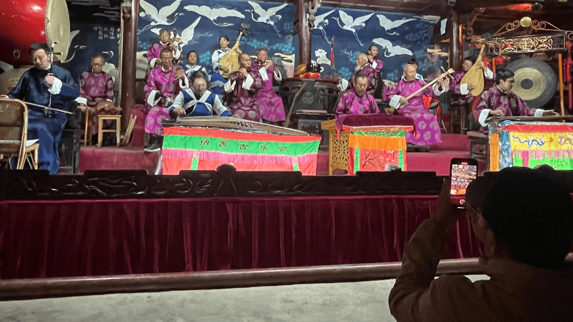 晚上8点多,通常是云南丽江古城一天中游客最多的时段。4月26日,大研纳西古乐会的演出开场后,还有游客停下脚步,购票入场。虽然观众席上的人数和舞台上的演奏者差不多,但大研纳西古乐会负责人文嘉已经看到了复苏的迹象。白天,场馆楼上也比以往热闹。