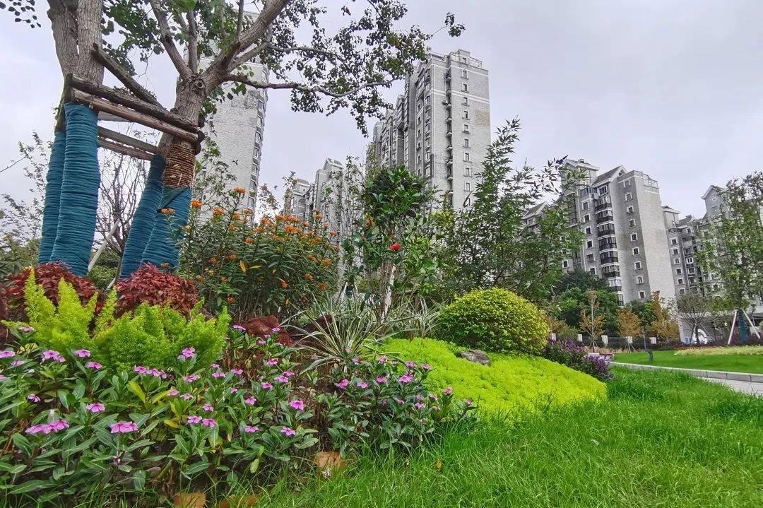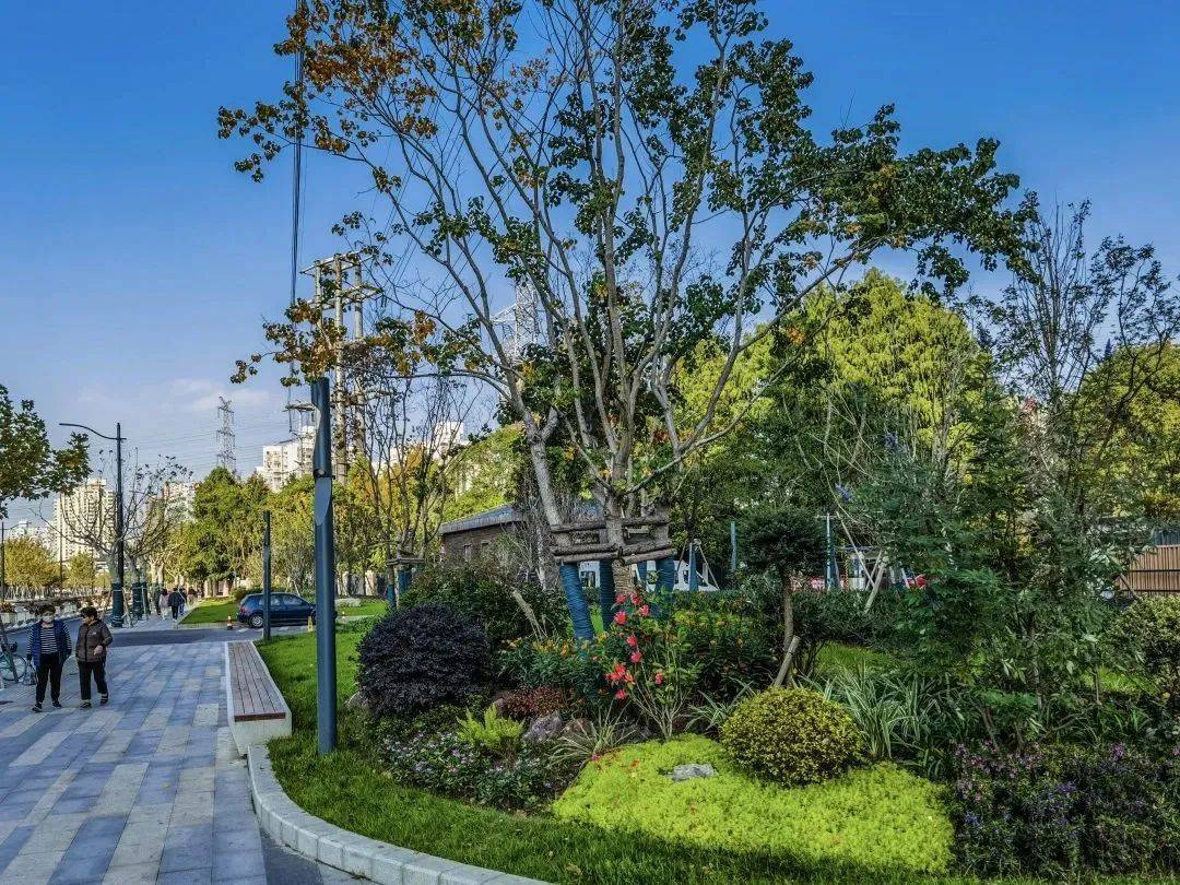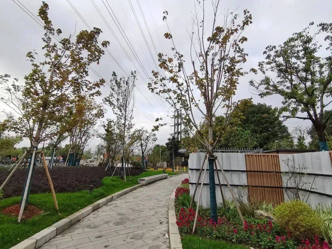 呼应大渡河路中分带呈线性布置的林冠线风貌,该座口袋公园主园路两侧种植同样品种的红花槭“十月光辉”,提供了近距离步行游赏红花槭秋季色彩的沉浸式体验,与之匹配的是丛生朴树、丛生乌桕等秋色叶树种,自2022年秋季已初具色叶规模。