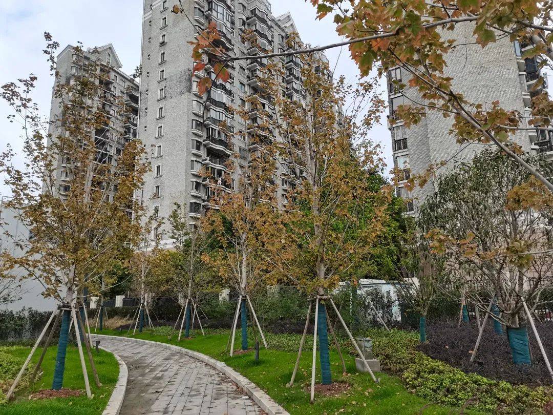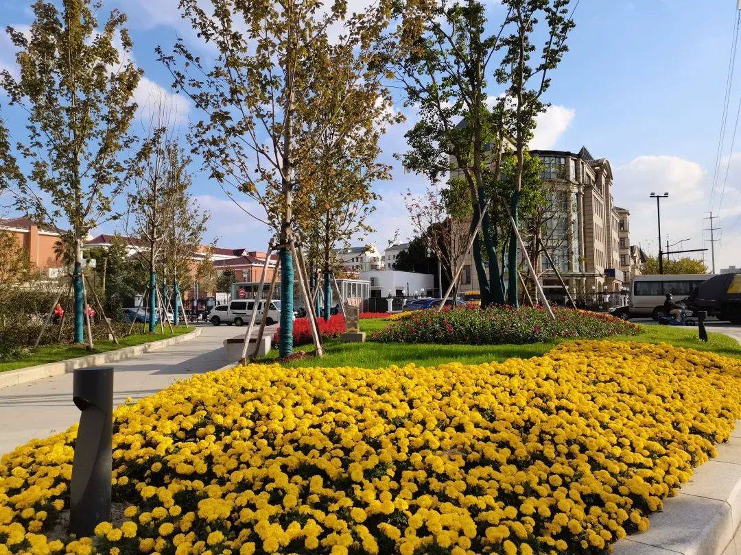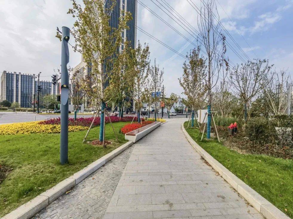 每当秋意款款袭来,红花槭披上了金色的礼服,整座园子在香樟等背景植物的衬托下,仿佛一曲红花槭协奏曲,凸显了大渡河路景观道路“音韵悦动”整体设计风格。