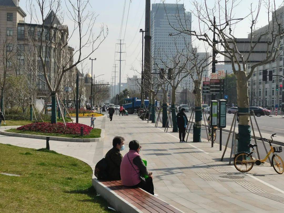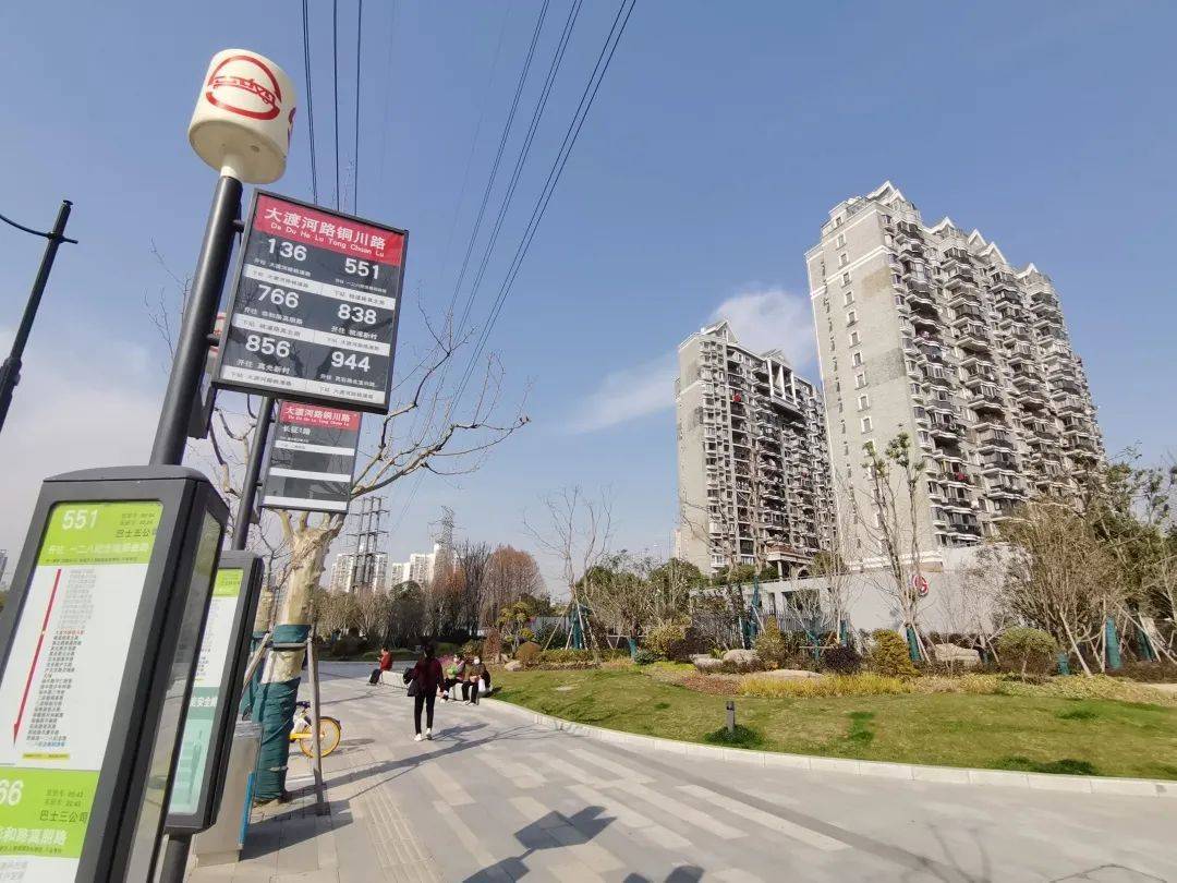 从铜川路站1号口出站后不远处的人行道边即是港湾式公交车站台,口袋公园面向公交站台设置了座椅,供换乘的路人停留休憩。