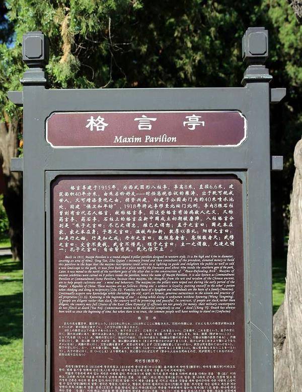 这些格言寓意多为治病救人,故又称药言亭或药石亭。此亭为1915年朱启钤的好友、时任总统咨议雍涛,出于既可规诫世人,又可增添景观之由,捐资兴建,是全园唯一一座西洋式亭子。原建在南大门内,后因建“公理战胜”石坊,1918年移至此处。1955年8月因认为这些格言不合当时的政治环境,公园奉令将格言亭八根石柱上的字迹全部磨掉。