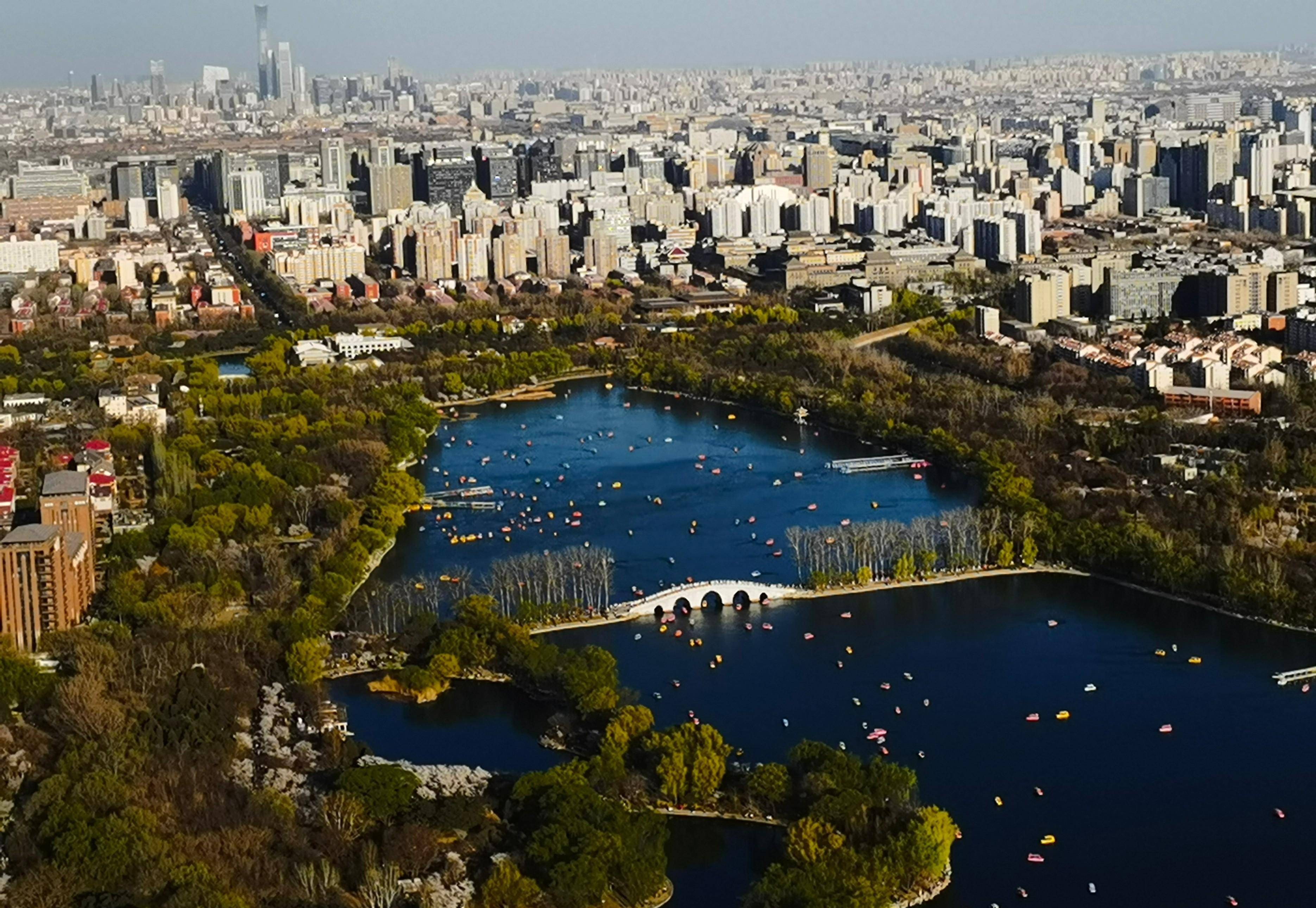 在238米高的2023电视塔上俯瞰玉渊潭公园樱花展全貌。