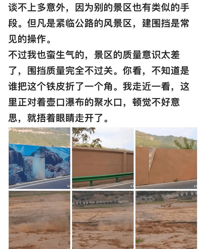 风景区大都是当地的一棵摇钱树——门票收入,旅游市场收入等,都可以生财有道,可像黄河壶口瀑布这样较为单一化的景区,路过者从旁边的公路上,也能一看究竟,但显然,壶口瀑布景区就挣不到一分半毛了,于是乎,借着所谓的“为了游客安全”之名,就堂而皇之地将瀑布沿途公路给遮挡了起来。