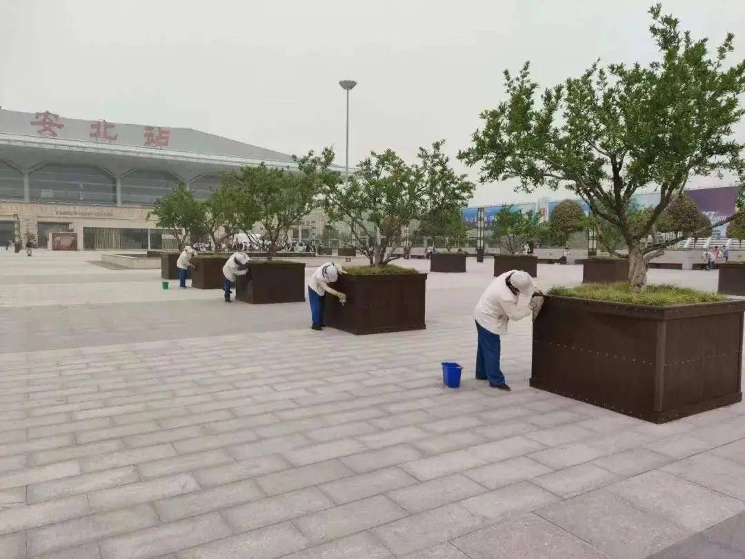 组织保洁、绿化、市政等维护单位开展节前“大排查、大整治、大擦洗”活动。安排保洁人员35人对南北广场果皮箱、护栏、座椅、标示标牌、绿化花箱、保洁工具箱等进行擦洗和修缮;坚持全方位立体式降尘作业,采取“人工+机洗”相结合模式,出动冲洗车对广场地面进行冲洗,配合人工刷洗,增加湿扫和抑尘频次,控制地面扬尘,提高地面洁净度;对广场主干道、重点区域和广场绿地开展修剪除草、浇水冲洗、病虫害防治及设施维修等工作,持续营造站区干净整洁的城市环境。