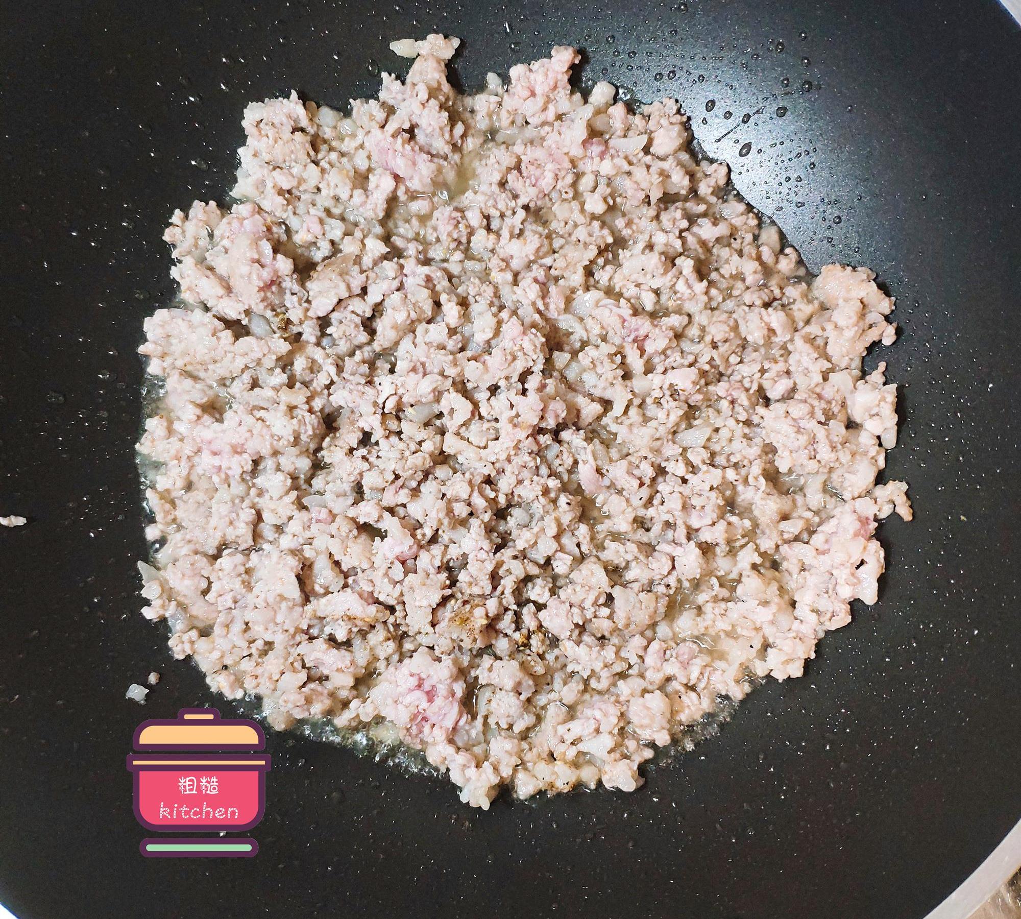 3、锅中加入少许油,倒入猪肉末翻炒,加入一勺料酒去腥,将肉末翻炒变色。