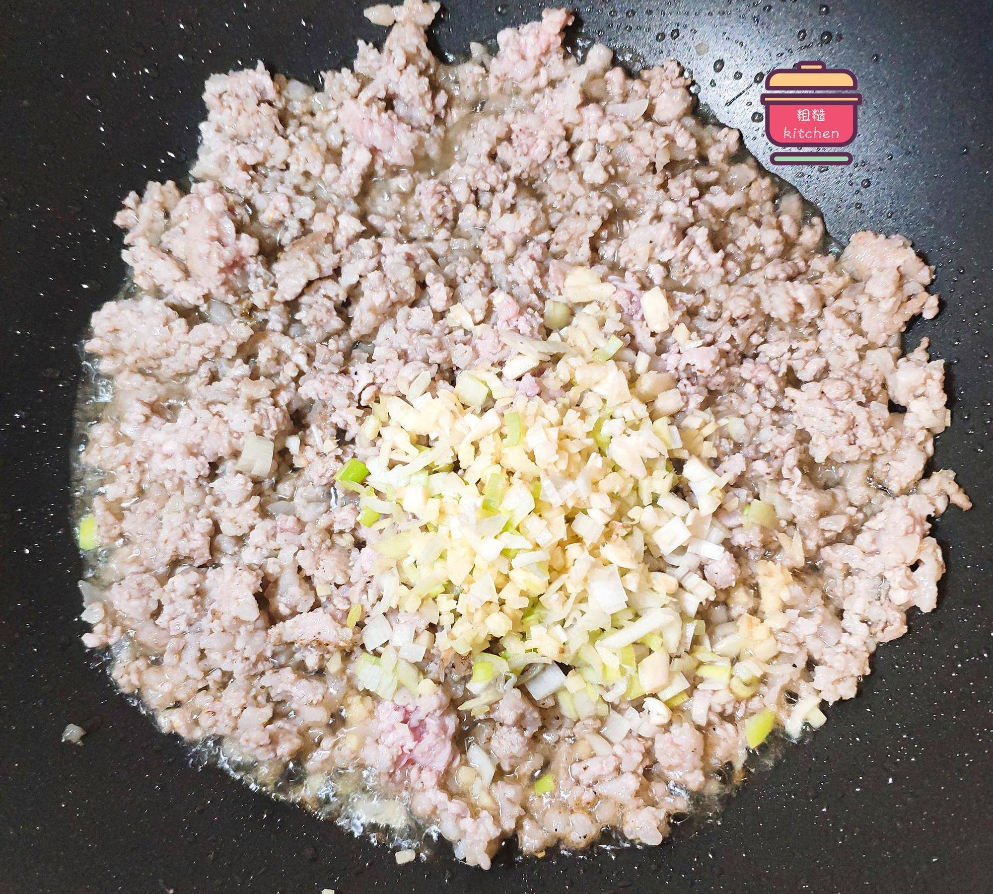 4、猪肉大约5分熟时加入葱、姜、蒜末倒炝锅,这样的做法可以进步去腥提鲜。