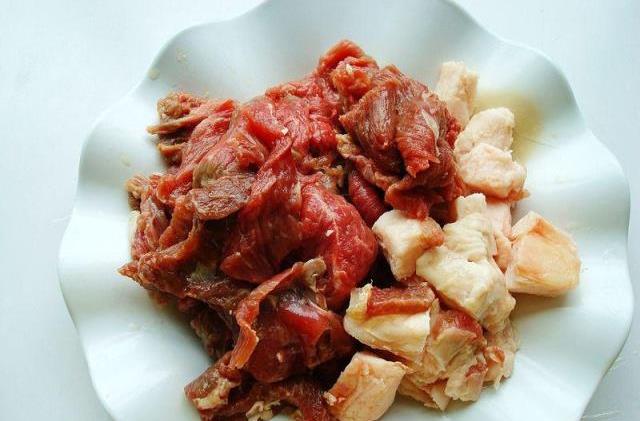 做法:1、把羊腿肉切薄片(也不要切太薄了,一定要把那些肉上的筋膜去掉,要切的大小一样厚薄一样,这样熟了鲜嫩一样),羊尾巴油切片