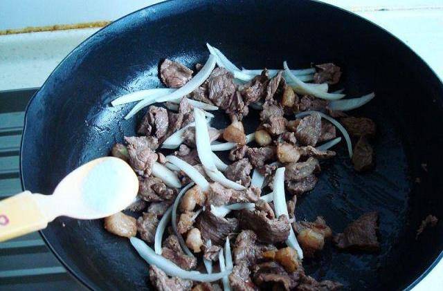 5、加洋葱丝翻炒出香味出水分,变软