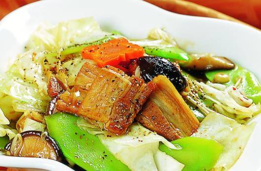 黑椒五宝蔬炒咸猪肉:咸猪肉洗去外表醃料切薄片备用,锅热入油放入蒜片辣椒炒香。放入咸猪肉片炒时加些米酒炒至肉呈焦黄感后,入芹菜炒,再加入各色彩椒炒,加入黑胡椒调味后即可起锅。味道鲜香,令人回味无穷。