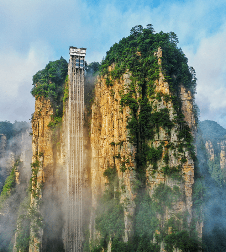 百龙天梯将张家界国家森林公园内的金鞭溪、袁家界、天子山等主要景区连成了一体。从金鞭溪附近到袁家界步行耗时约2小时,乘坐天梯只需2分钟即可到达。电梯垂直高差335米,运行高度326米,三台电梯并排运行,每台都是由全透明玻璃构成。百龙天梯因其“世界上最高、运行速度最快、载重量最大的电梯”而被载入基(吉)尼斯世界纪录。
