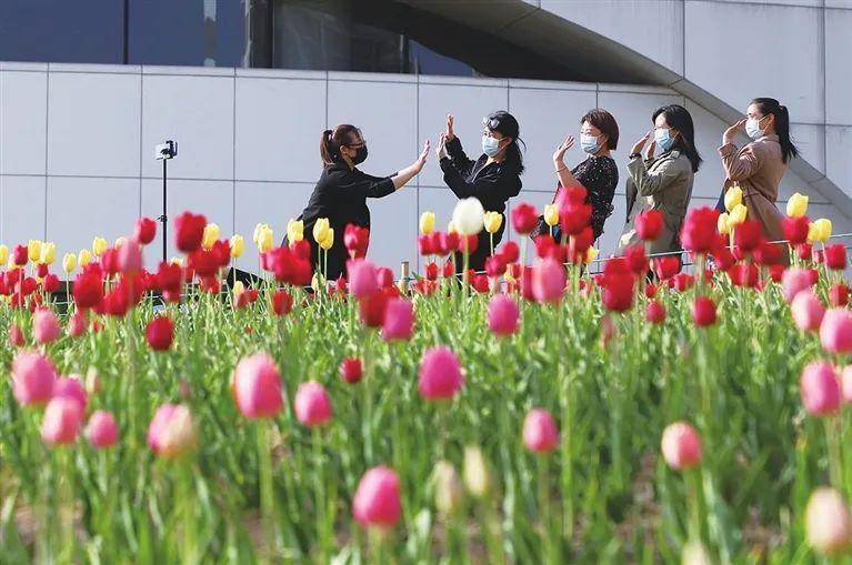 ▲ 晋阳湖畔,市民徜徉在郁金香花海。张昊宇 摄