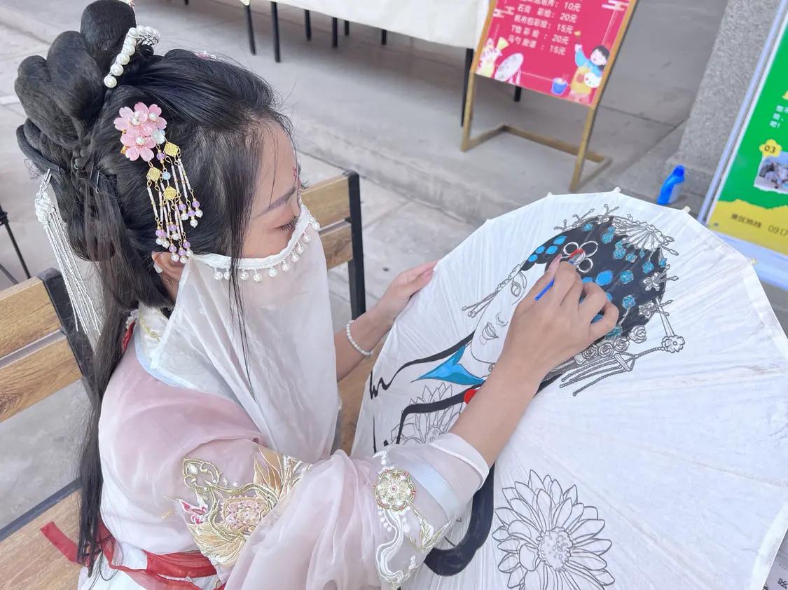 不少身穿古装的游客正在拍摄照片和短视频,记录美好时刻。而在寻唐记手工作坊内,小游客正体验扇面、伞面、沙画等手工乐趣。