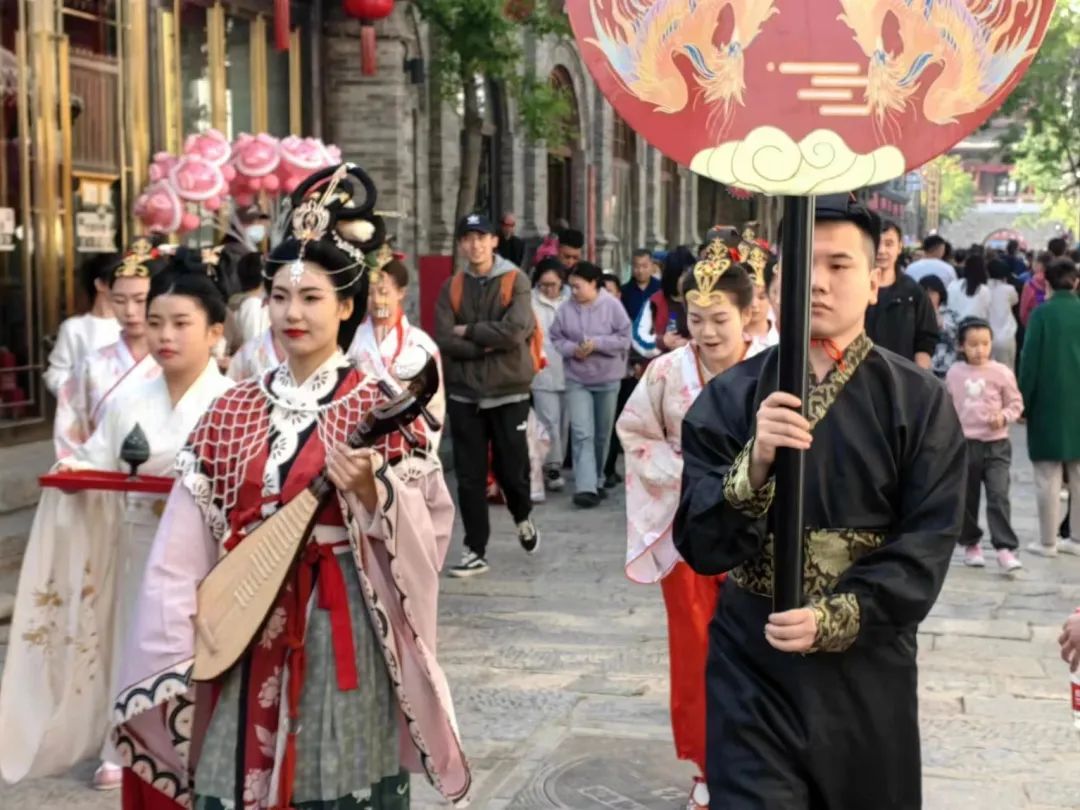 在古城南北大街上,一群人穿着古装,几位男士身着玄服,英姿飒爽,女士披戴绫罗绸缎,落落大方,他们排着整齐的队伍,上演《昭君出塞》,让市民和游客亲切地感受到忻州深厚的本土文化底蕴。大家纷纷驻足观看并拍照留念。