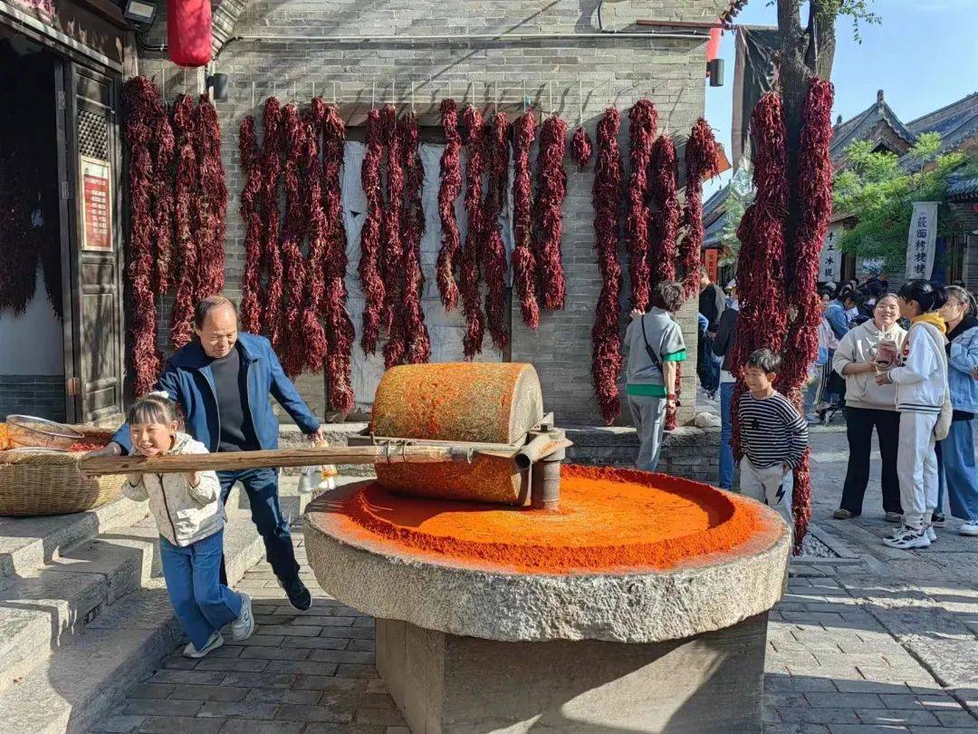 辣椒房前,大人孩子们推着石碾碾出的辣椒香味吸引了许多市民和游客纷纷上前围观拍照。