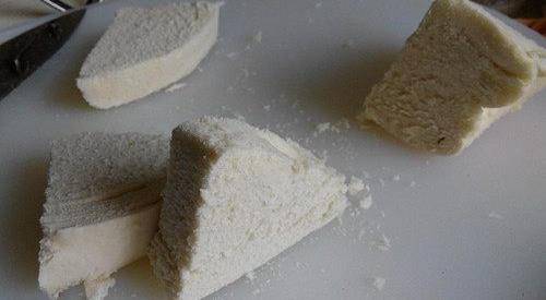 第二天就开始做鸡蛋炸馍片。先把吃剩下的馍切成片状。最好能切的薄一些,而且要切的均匀。这样做出来的鸡蛋炸馍片卖相比较好看点的 。