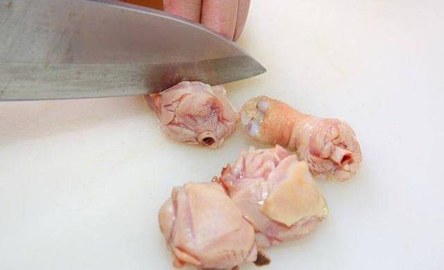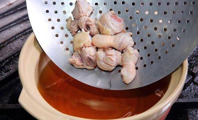 Step3:鸡腿切块,放入滚水中汆烫去腥,捞出沥干备用。