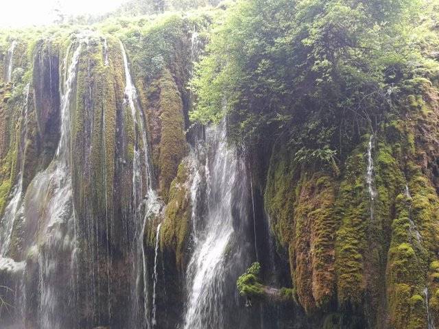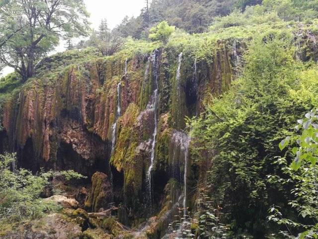 沿着栈道徐徐而行,一阵阵清凉的水雾扑面而来,兴奋之余,一道瀑布映入眼帘,这是一个约有两个足球场大的由碳酸盐类岩层构成的台地,形似一把打开的巨型扇子。泉水从山脚下的岩石间涌出,受沉积的碳酸钙等物质影响,形成清泉伴韵、色彩斑斓的钙华滩流。水滩缓缓流淌,日积月累,沉积成大面积钙华。满滩的水草、苔藓、地衣黄绿相间,流水擦滩而过,激起无数水花,在阳光照射下犹如无数颗滚动的珍珠,形成奇妙的珍珠滩,四周弥漫着淡淡的水雾,画面格外温柔、唯美。