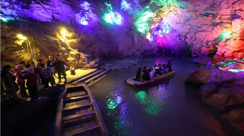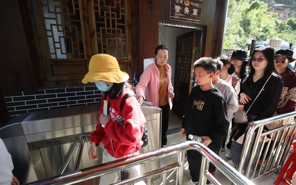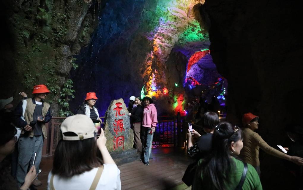 在国家4A级景区无源洞,游客在导游的引导下有序入场。大家时而驻足观赏,时而拍照,寄情山水,享受闲暇假期时光。