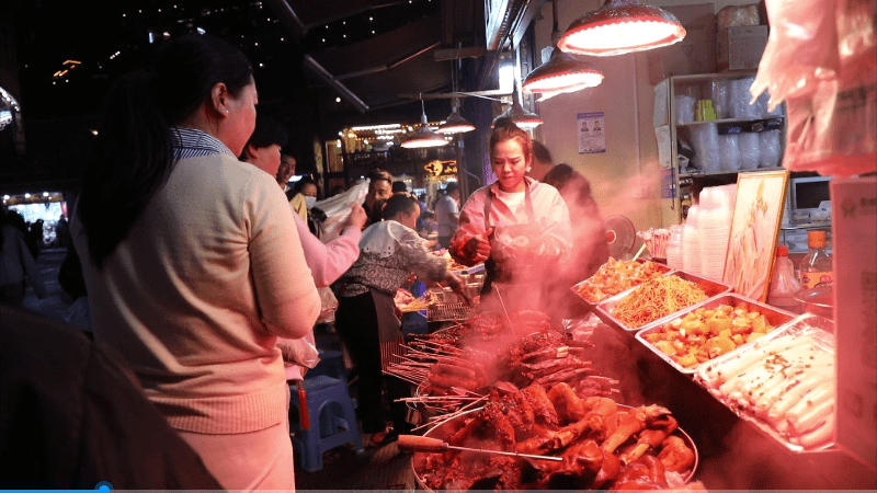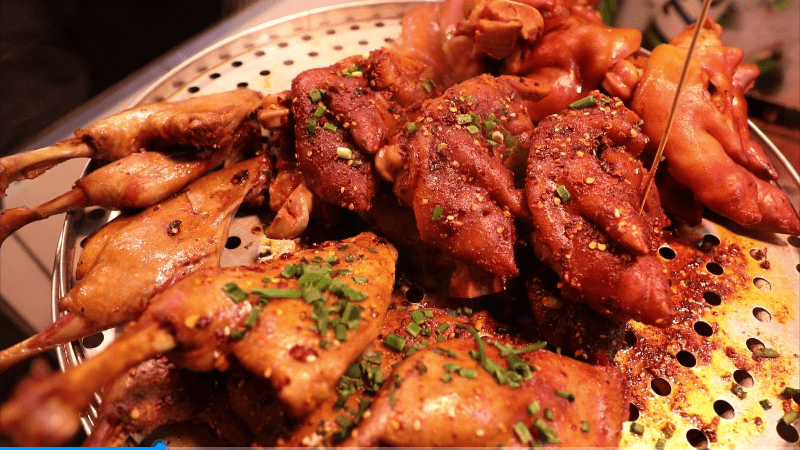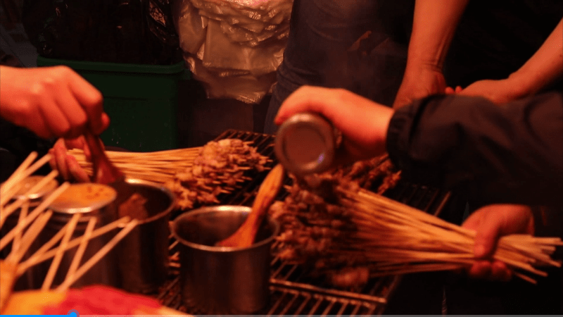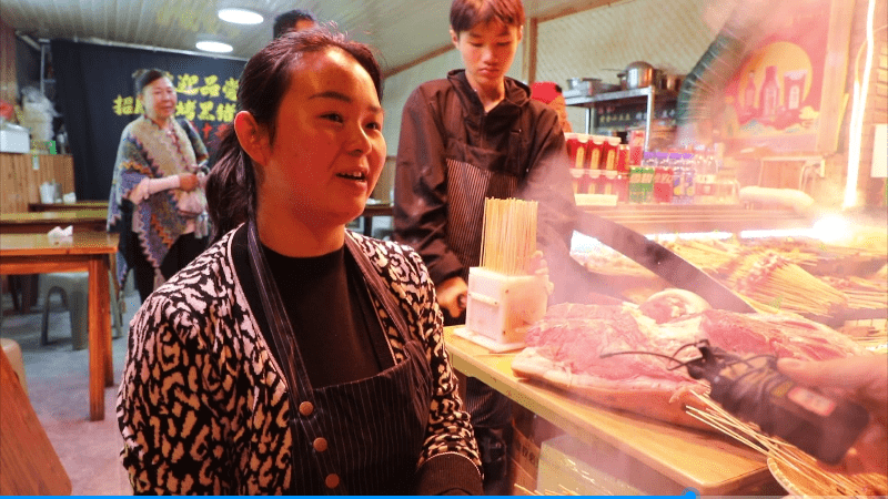 “现在我们烤肉串都烤不快,我们的肉串都是现切现烤的,我们预计今天可以把这条猪腿卖完,估计有6000串,还有其他的其他的素菜,一天客流量消费大概有七八千。”