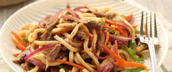 看到了昨天在超市买的袋装乌冬面, 再翻出块牛肉, 就用这几样东西搭配在一起不正是好吃的黑椒牛肉炒乌冬面吗?正好一个人分量, 再加入牛肉和蔬菜一同炒,营养、美味、养眼还能果腹。炒好的乌冬面吃着Q弹很有嚼劲,牛肉丝嫩嫩的, 带着黑椒独特的香味, 味道非常棒, 是一道营养丰富,荤素搭配的主食。