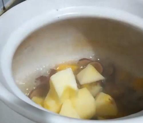 4、把红薯块煮软之后再加入苹果块一起煮。