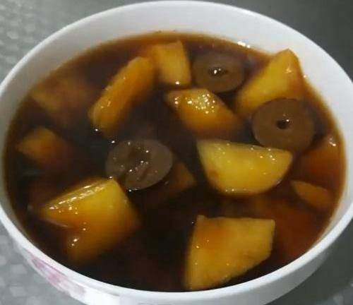 6、苹果红薯红糖汤煲好出锅盛碗,就可以美滋滋地享用了。现在天气特别的寒冷,所以建议大家煮好之后要趁热喝口感会更佳哦,不要放凉了才喝,这样不利于我们的身体,如果冷了的话热一下就可以喝了。
