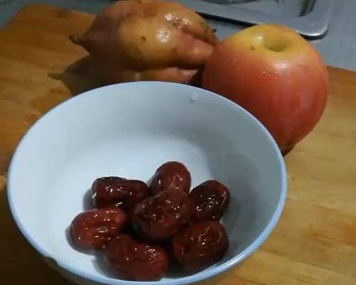 准备食材:苹果1个、红薯1个、红枣适量、红糖适量。