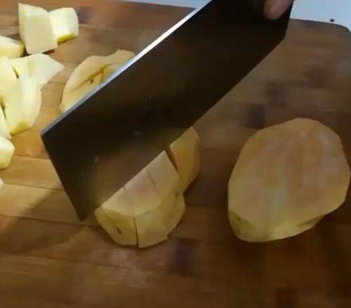 2、把红薯和苹果都分别去掉外面的一层皮,然后清洗干净再切成滚刀块备用。