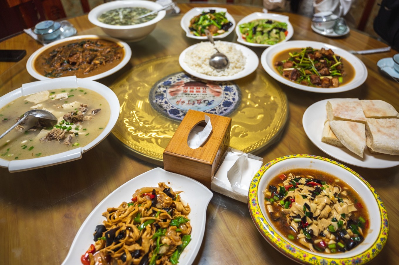 点了鱼头泡饭(必点菜)、小炒肉(必点菜)、土烧打野小公鸡、小炒野山笋、牛肉锅仔、酸菜炖羊肉、红汤羊肉汤、洛馍撒子、荞麦胡等等,对于出生在北方我的来说,这里的饭菜简直就是家乡菜。鱼头经过长时间煨制,鱼肉软烂且汤汁浓郁,将汤汁浇在刚煮好的米饭上,米饭的香甜与鱼汤的浓郁混合在一起,那味道鲜美极了!