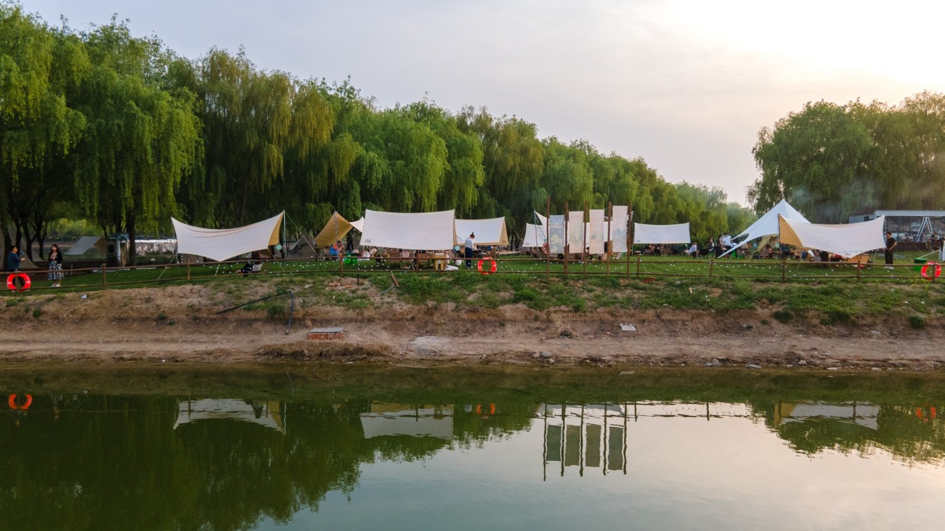 整个营地分为两大部分,引河河畔露天的营地和新汴河畔藏在林子里的营地,帐篷数十顶,规模颇大。从空中俯瞰,双河交汇的营地景色相当壮观,清幽的环境,清澈的河水,真的是理想中的露营地。