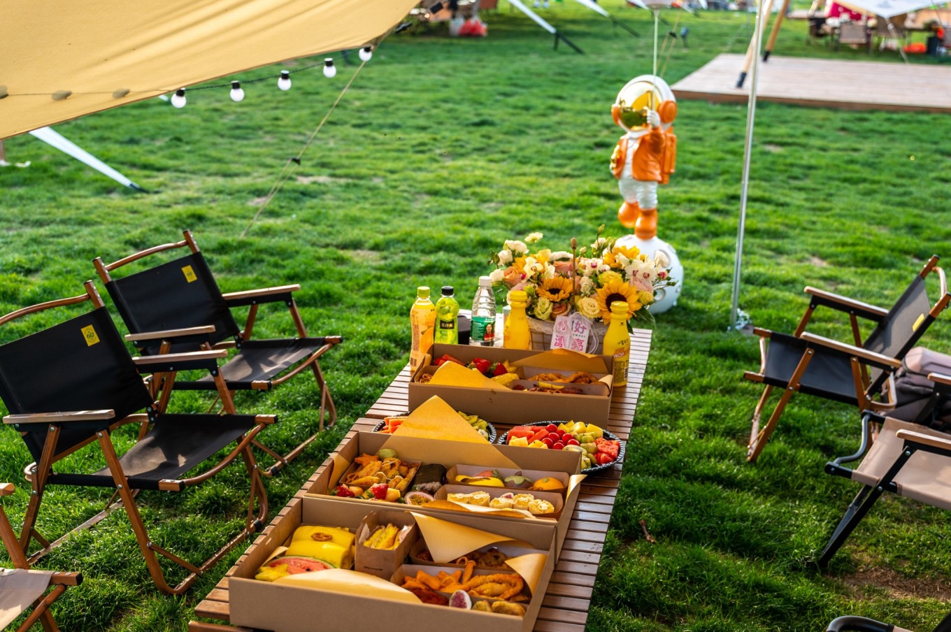 营地的帐篷类型非常多,设施齐全,有专门的户外野餐桌、靠椅、桌布、毛毯、休闲躺椅、烧烤架等,一应俱全,而且还非常适合拍照,随手一拍就是一张慵懒的唯美大片。