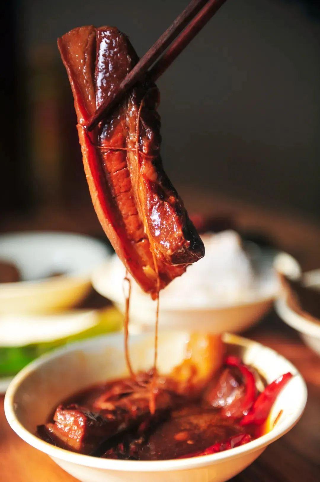 肥瘦相间的块状五花肉,一口咬下去,猪肉皮紧实弹牙、脂肪层肥而不腻、瘦肉部精而不柴。此时再搭配上一碗浇了肉汤的大米干饭,简直是胃口和心灵的双重满足。