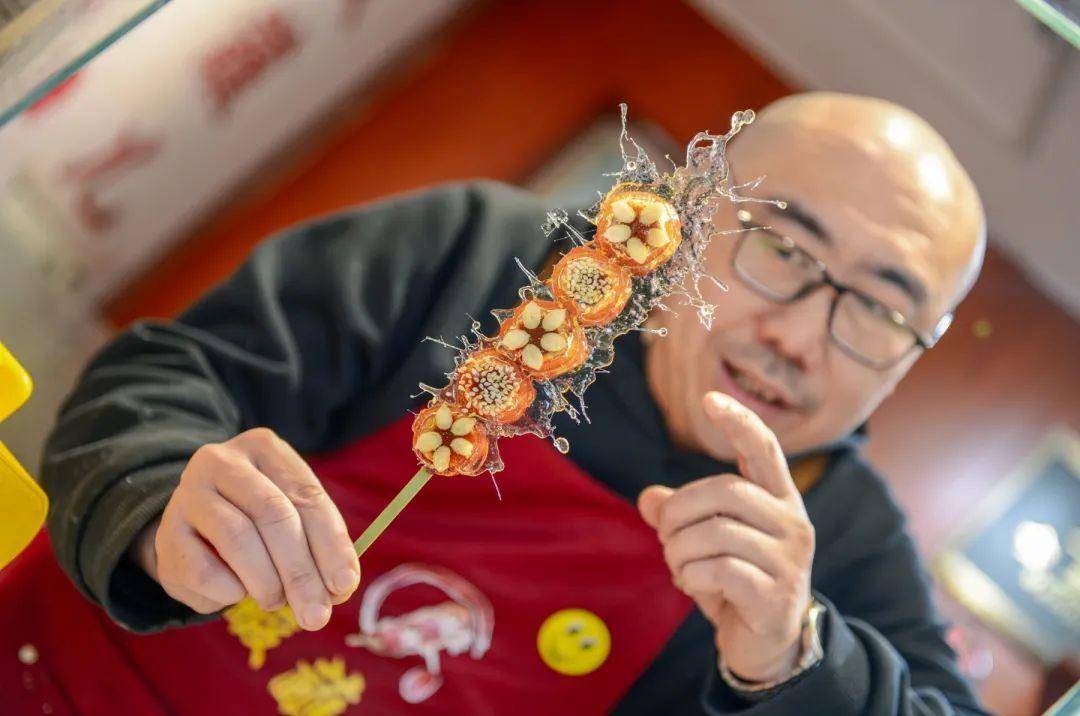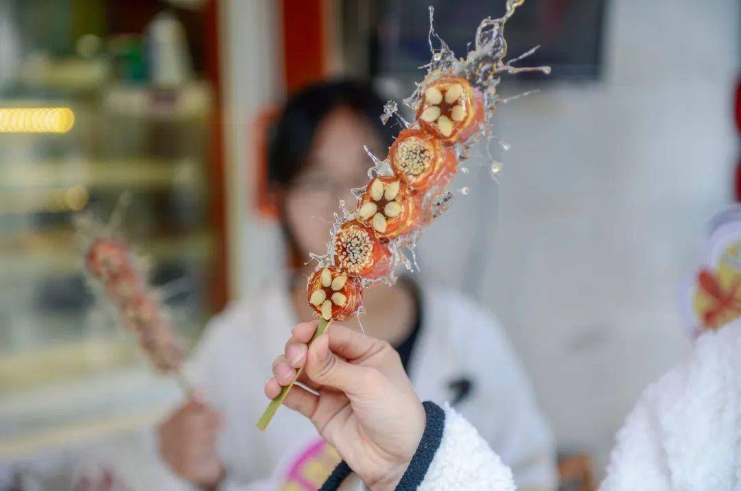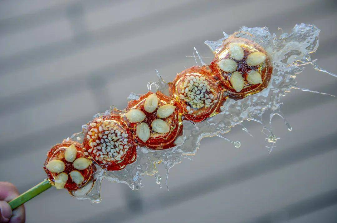 这可是济南人对糖葫芦独特的昵称。将山楂中间的籽去掉,填上豆沙馅,裹上由冰糖、香油和近在咫尺的泉水制成的糖衣,吃起来有淡淡的香油味道。