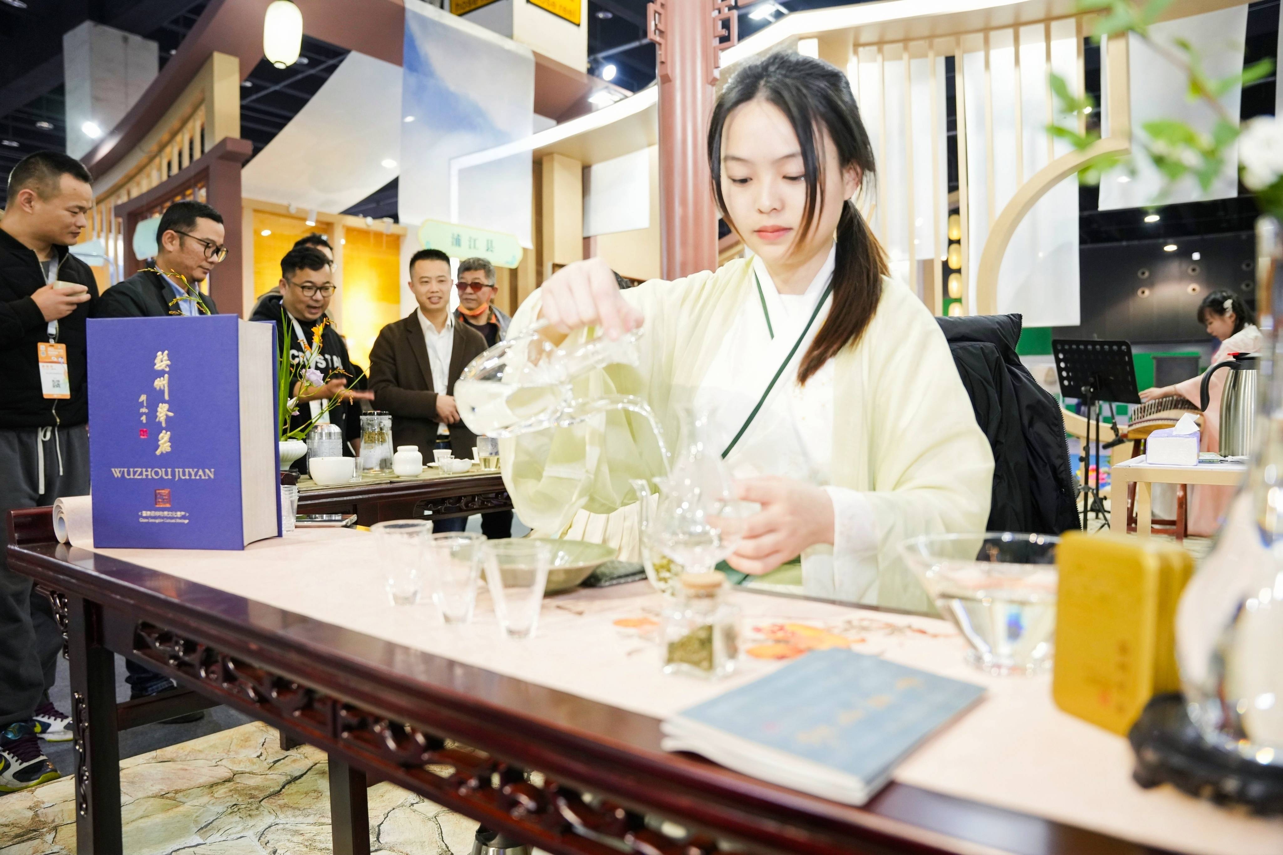 婺式建筑与宋韵美学的交融共生,是金华古城重要的文化特征,也是金华馆的一大亮点。现场不仅“搬”来了八咏楼,还特别设置宋韵凉亭,邀请来自金华的非遗匠人为广大游客表演婺州举岩茶宋代点茶,营造如梦如幻的沉浸式非遗展陈。“现场观看大师点茶,碾茶、点茶、分茶等操作高效利落,配合悠扬的音乐,仿若在欣赏一场高雅的宋韵文化演出,我正考虑开发新的金华宋韵文化游产品,让游客也体验体验。”来自杭州的旅行社负责人张建表示。
