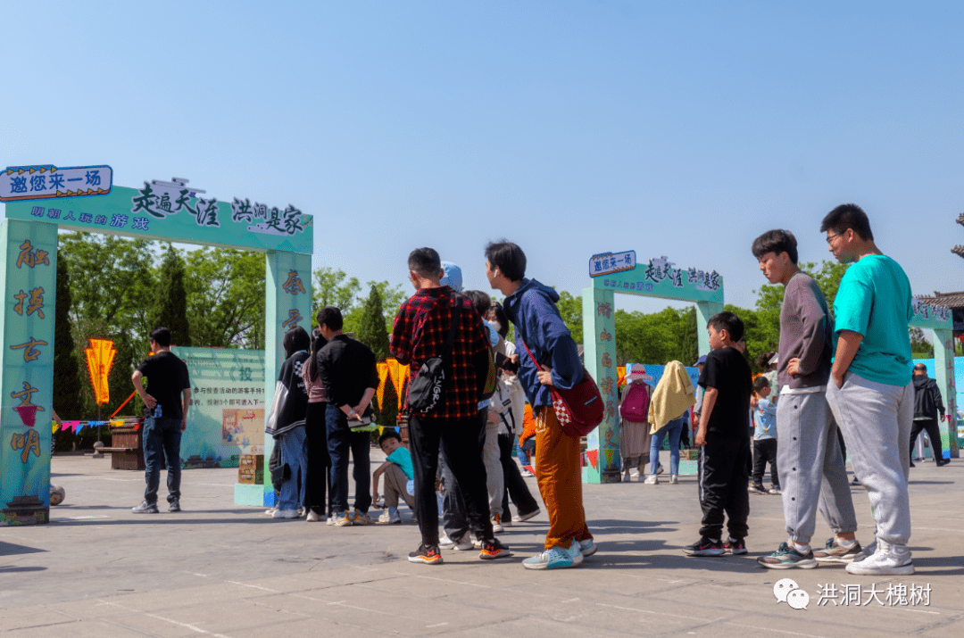 4月30日,“五一”假期第二天,洪洞大槐树寻根祭祖园景区祭祖广场上,最中心位置特别布置的绿化景观前很多游客在驻足拍照打卡,一旁数米处“趣味冲关·悦动五一”活动现场,更是欢声笑语不断,热闹非凡。