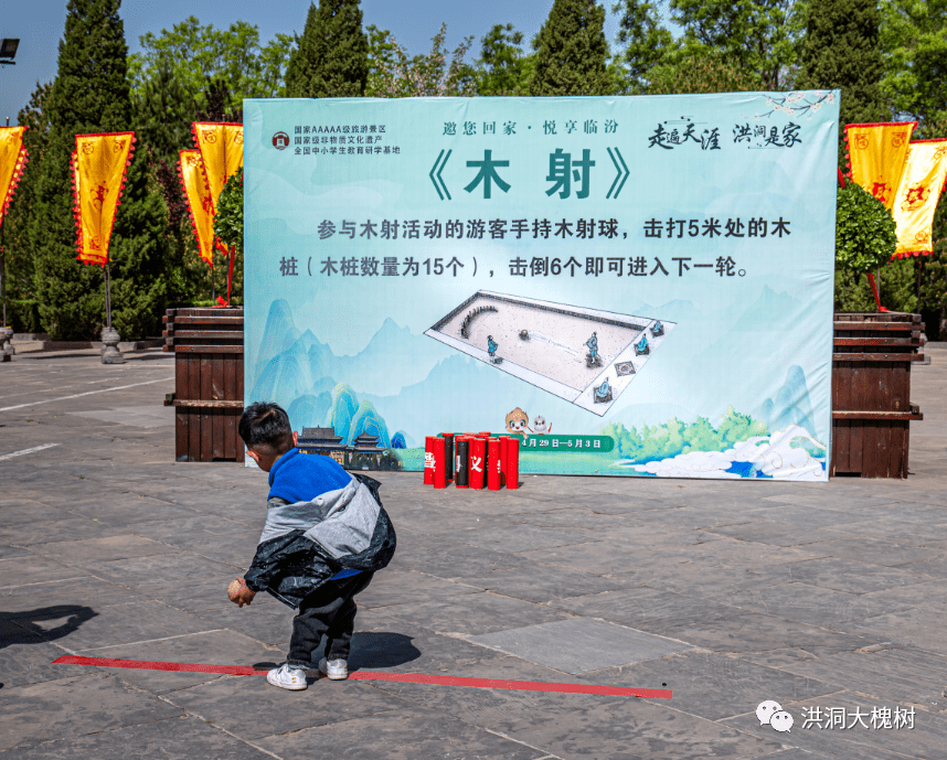 “趣味冲关·悦动五一”是洪洞大槐树·五一寻根之旅中的一项互动闯关类活动。整个活动包含木射、投壶、蹴鞠三关,游客依次闯关,三关都成功者便可获得景区准备的纪念品一份。据景区活动策划者范正健介绍,五一假期首日,仅该项活动的参与者就有两千余人,成功闯关获赠者有400人。“百家姓书签、姓氏鼠标垫等景区文创产品作为闯关纪念品赠送,很受游客喜爱。这不仅让游客在大槐树老家拥有更好的体验感和更多获得感,也是对我们景区姓氏文化和文创产品的一种宣传展示途径。”