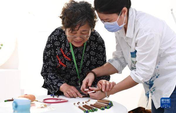 4月30日,在2023海南锦绣世界文化周非物质文化遗产传统织绣印染技艺项目精品展上,观众在向传承人学习编织青州府花边大套。
