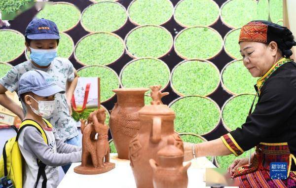 4月30日,小朋友在参观2023海南锦绣世界文化周非物质文化遗产传统织绣印染技艺项目精品展展出的黎族原始制陶技艺。