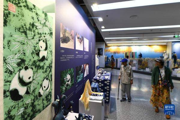 4月30日,观众在参观2023海南锦绣世界文化周非物质文化遗产传统织绣印染技艺项目精品展展出的自贡扎染技艺。
