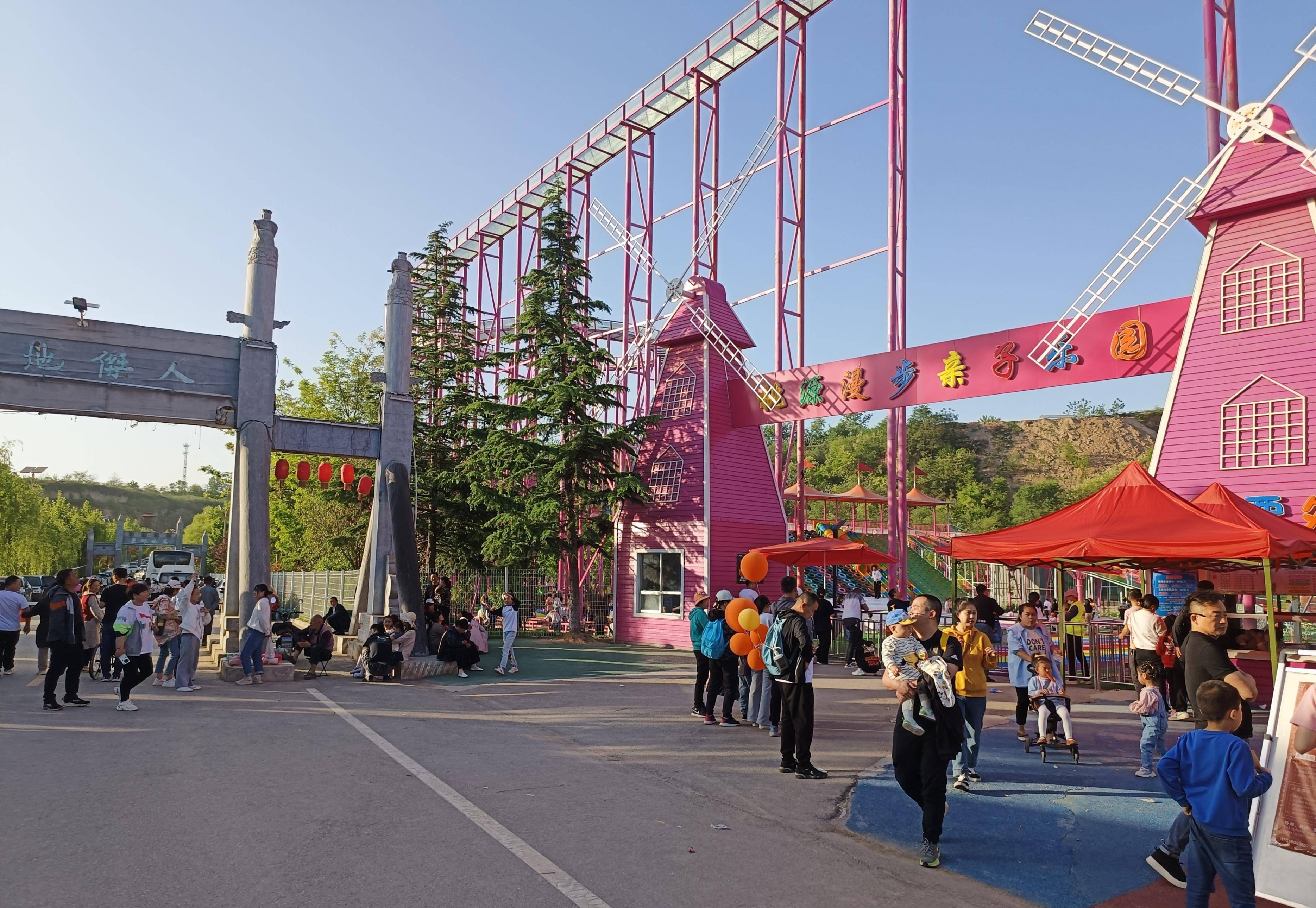 渭南桃花源景区开展锣鼓、秧歌、舞龙舞狮等民俗表演,让游客近距离体验特色的关中民俗文化。游乐场里玻璃、七彩滑道、旋转、卡丁车、小火车、蹦蹦床……各种儿童休闲游乐项目应有尽有,童趣十足,这里是孩子们快乐的天堂~