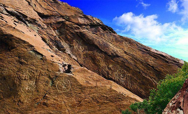 贺兰山岩画是中国游牧民族的艺术画廊。它描绘了现实生活中的动物、面孔、狩猎场景和一些西夏人物。太阳神的形象是一大亮点。