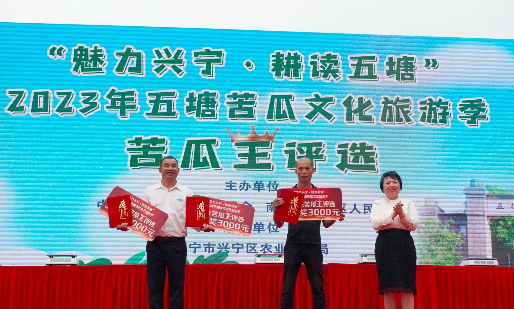 开幕式上,新编五塘苦瓜之歌、五塘苦瓜舞亮相,颇具国潮风味,让人耳目一新;“苦瓜仔”形象惊喜发布,苦瓜钥匙扣、苦瓜布袋苦瓜娃娃等五塘苦瓜仔系列文创产品同时推出,让现场市民直呼“好可爱”,传递了五塘苦瓜的良好形象;猜苦瓜和免费品尝苦瓜橙花汁、苦瓜香柠汁等活动,让市民赢得比赛,乘兴而来,抱瓜而归;备受瞩目的苦瓜王评比现场紧张激烈,经过一番角逐,最终陆坚邦的滑身苦瓜、白珍珠苦瓜,张袖瑞的绿珍珠苦瓜获得2023年兴宁区五塘苦瓜王评选一等奖。