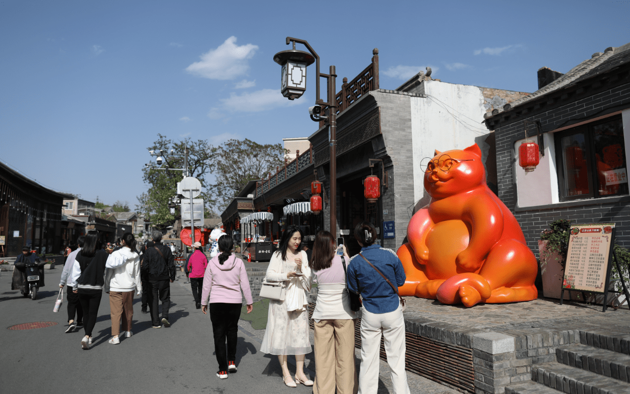 ▲2023年4月29日,北京模式口大街,街上一只大型橘猫吸引了很多游客驻足。新京报记者 浦峰 摄
