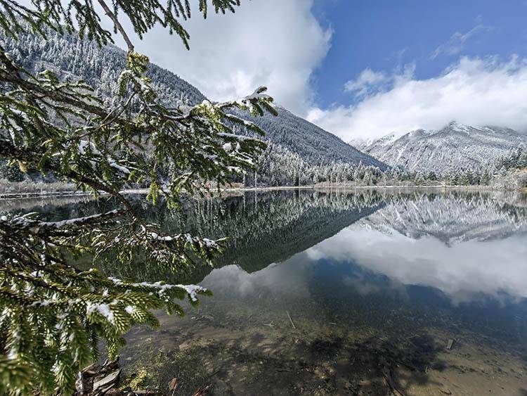 近日,达古冰川连降大雪,4860雪山之巅,白雪皑皑,仿佛是梦中的雪国仙境。山顶白雪覆盖,山下万物清朗。高原明媚的阳光温暖着大地,树枝萌发出点点新绿并随风摇曳,新冒头的小草配着湖水光波,有着“万物静观皆自得,四时佳景与人同”的惬意。