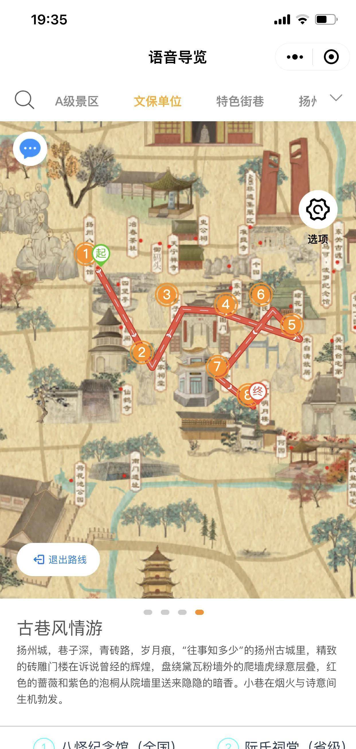出门旅游,首先要提前制订好旅游攻略和规划好路线。记者注意到,“明清古城电子地图”还提供了旅游线路规划,在地图的下端还提供了4条旅游路线规划,分别是春季赏花游、运河遗产游、文化博览游和古巷风情游。点击其中一条线路进入下一个选项,地图上还进行了线路的规划,用红色线路、箭头以及序号标注了整个行程,让游客可以按照线路指示畅游扬州。